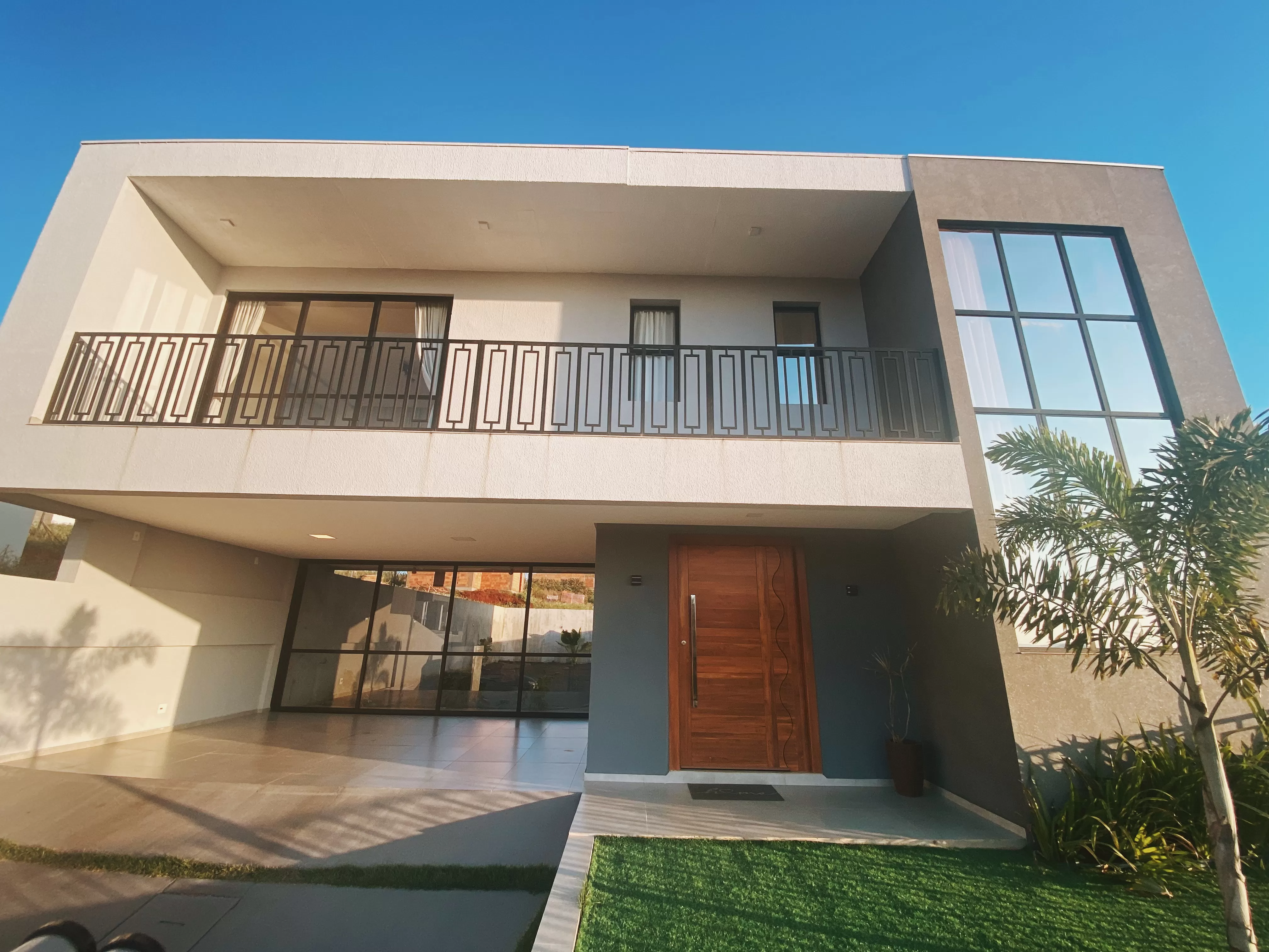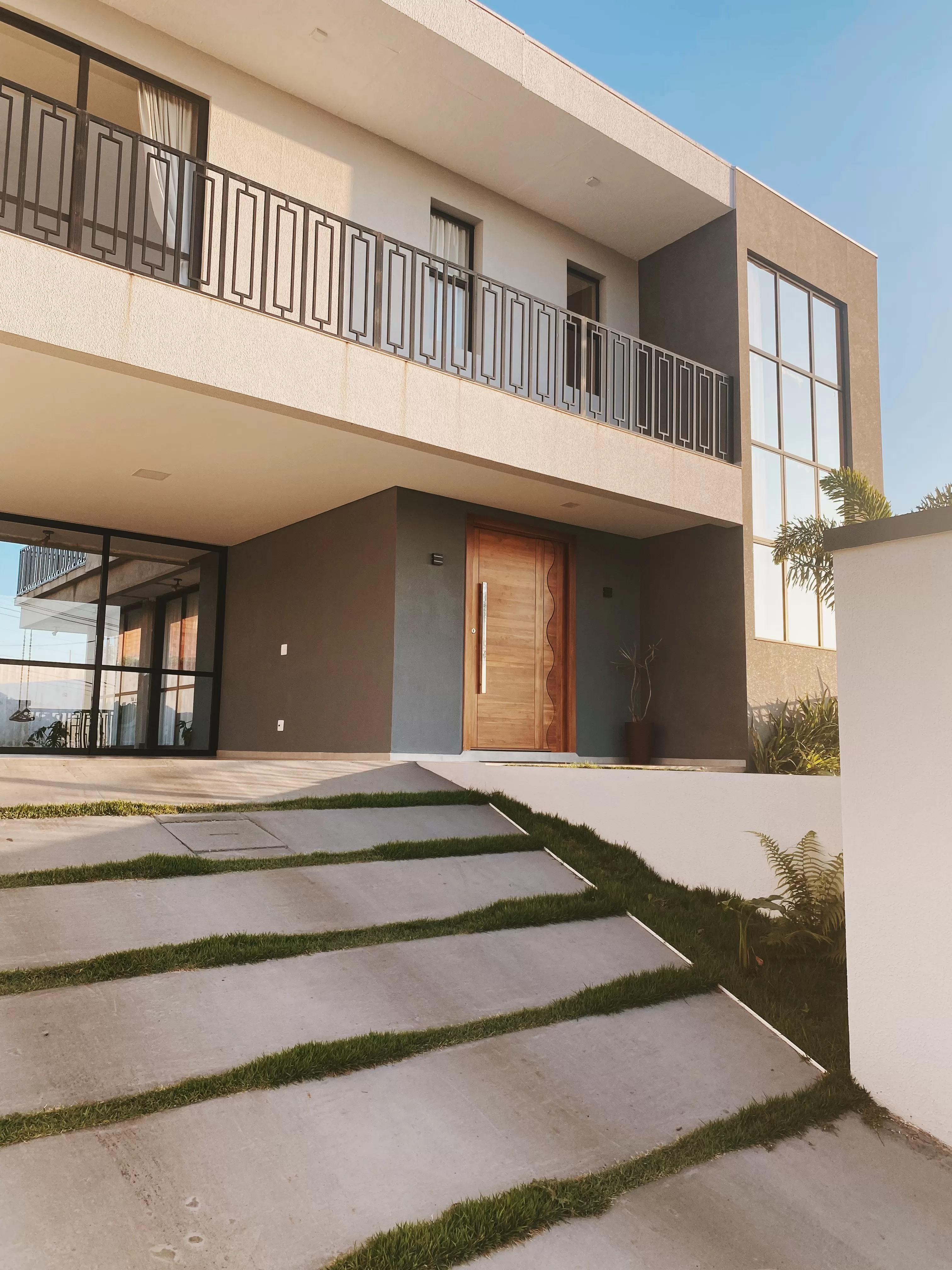 Outra característica marcante é a grande parede de vidro na fachada frontal, trazendo muita luz natural para os dois pavimentos. A casa é composta por uma suíte ampla e 2 demi-suites, todas com sacadas e portas janelas voltadas para a área de jardim, continuando com o conceito de permeabilidade dos espaços entre os ambientes internos e externos.