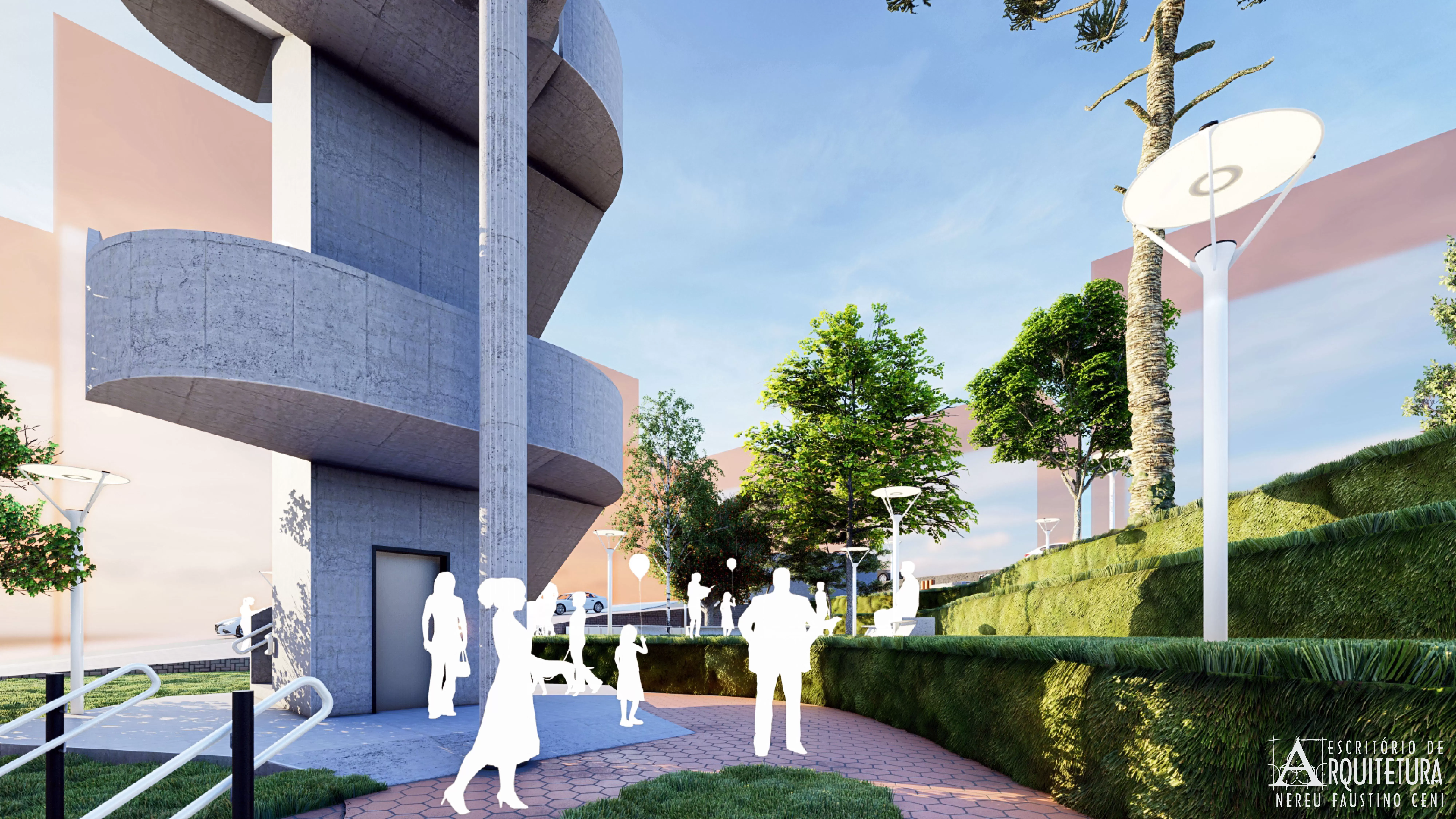 Praça proposta pelo escritório para a ocupação do lote na esquina entre as ruas Tocantins e Osvaldo Aranha no Município de Pato Branco. Intitulada de Praça do Cooperativismo para instigar as pessoas a atuarem de forma solidária e fraterna no convívio urbano e na preservação do meio ambiente.