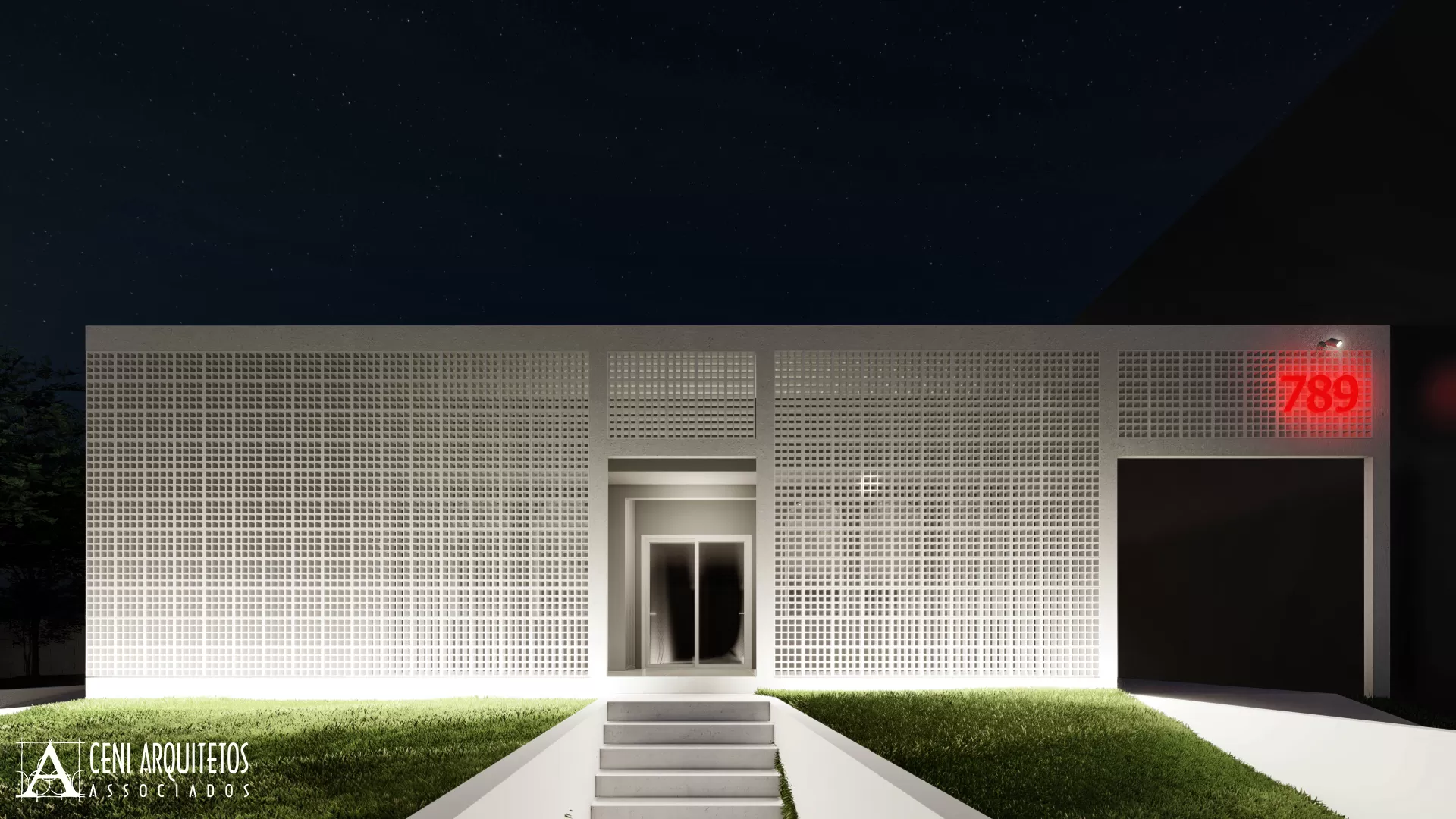 Optamos pelo uso de elementos vazados de concreto pintados em branco, envoltos por estrutura de concreto aparrente, trazendo conforto e privacidade principalmente por ser fachada Oeste, onde recebe muito sol a tarde. Canaleta de iluminação com led cor branca destaca a geometrica dos blocos à noite. No recuo, o totem em blocos de concreto receberá as logomarcas das empresas que utilizarão o espaço.