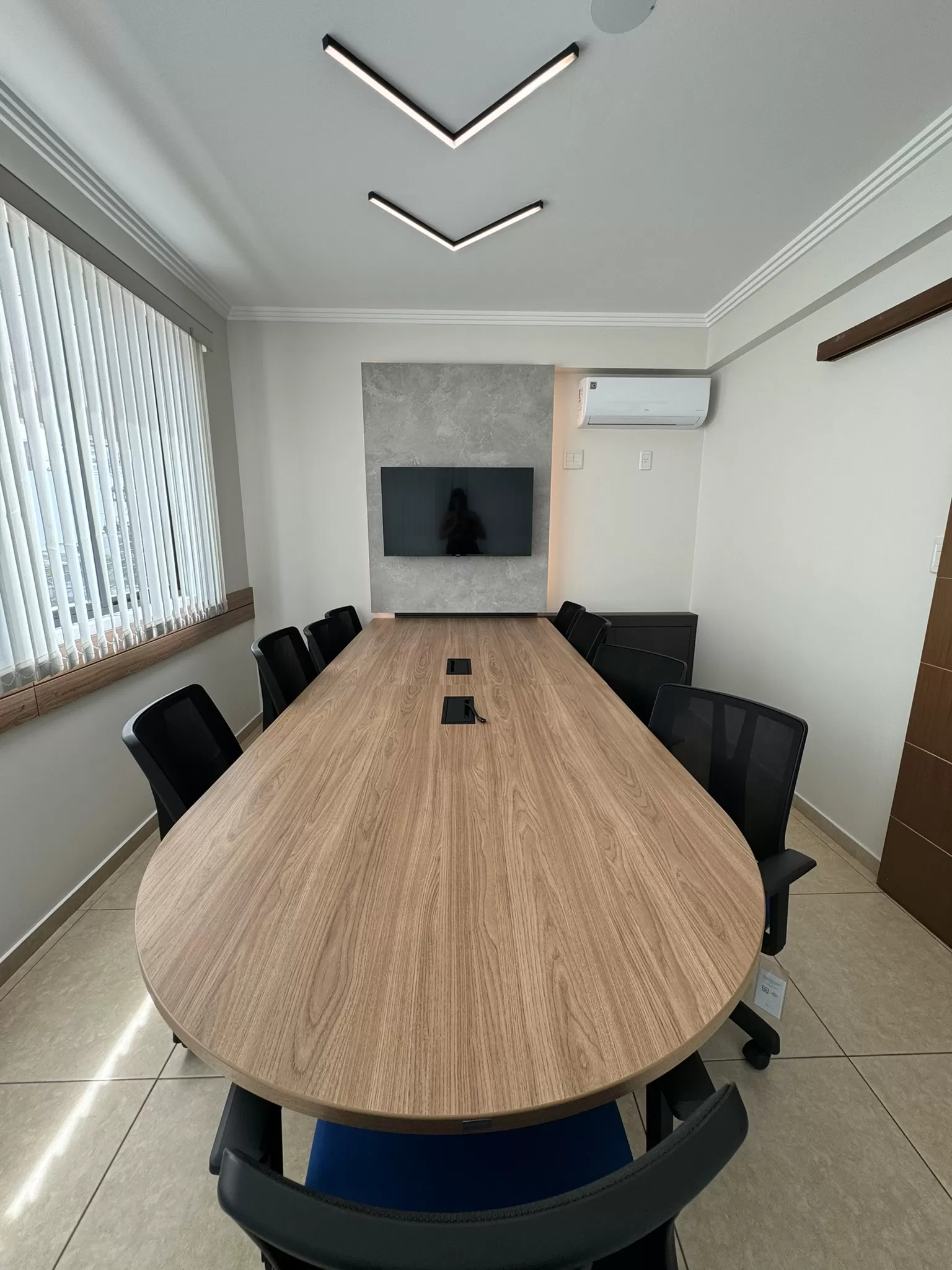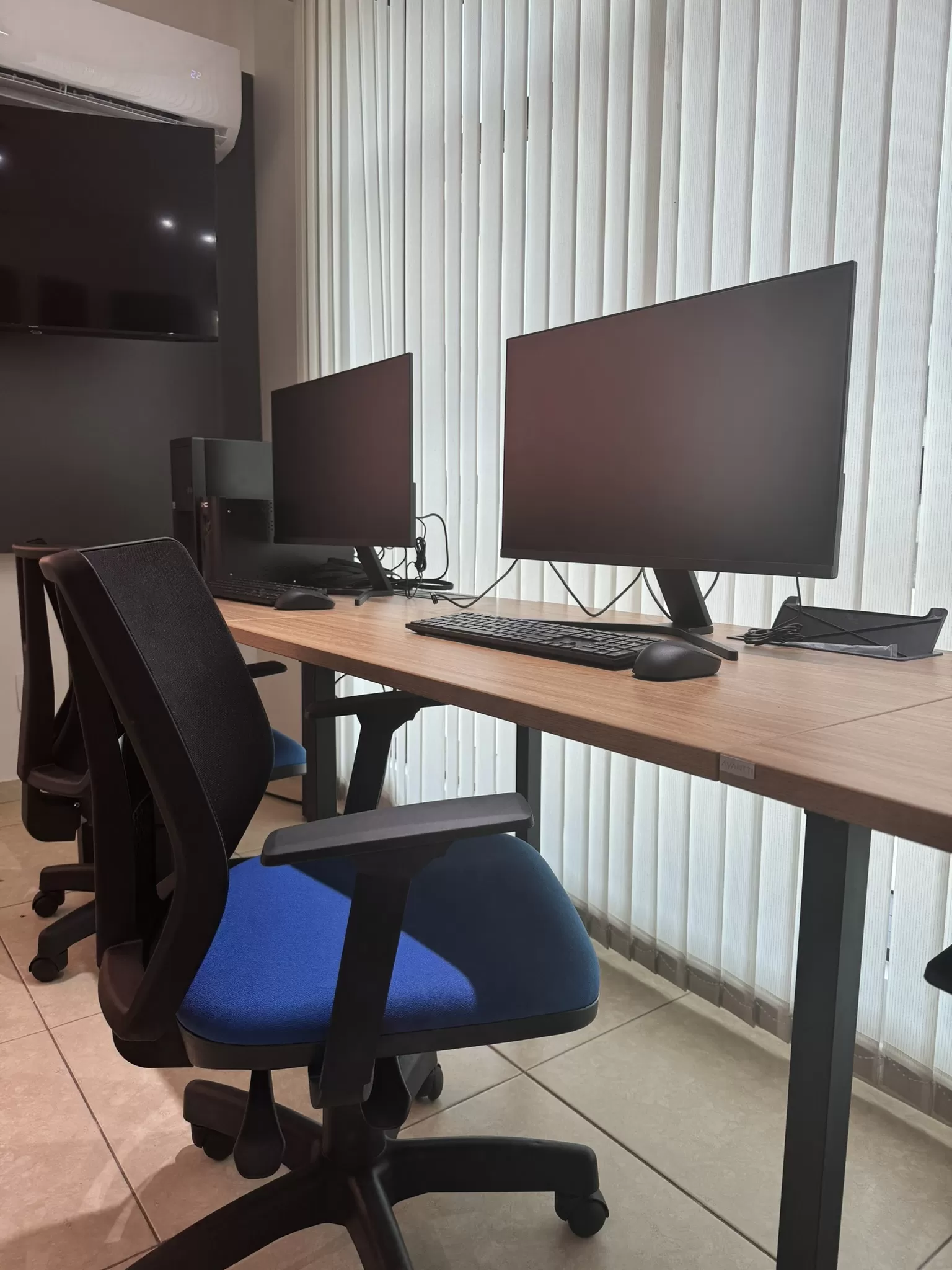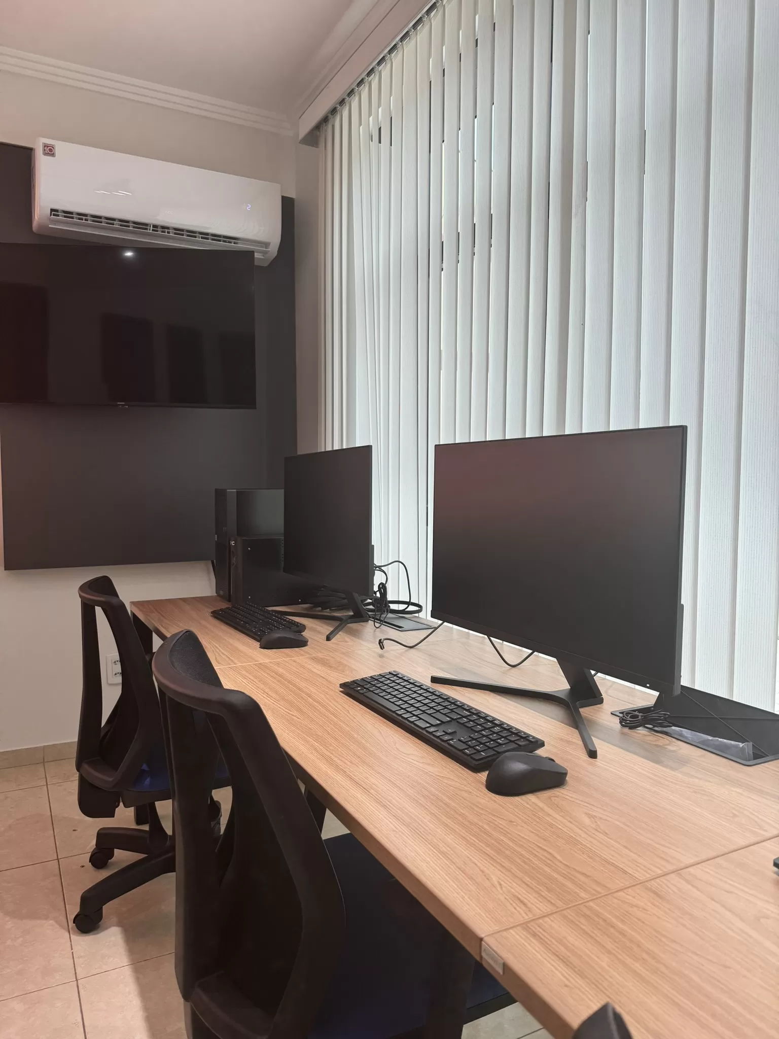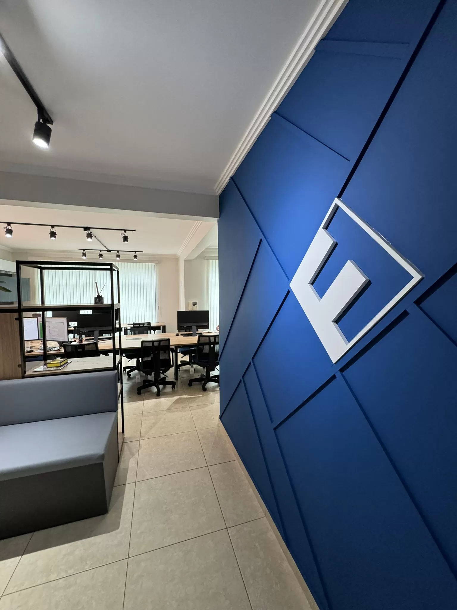 Projeto de uma reforma onde foram retiradas divisórias em drywall para que a sala de trabalho comportasse todos os funcionários em grandes mesas de trabalho conjunto. No projeto de interiores foram criados três ambientes. O primeiro que acolhe os funcionários e os eventuais clientes com um hall com paredes nas cores da empresa e com as logos em destaque e um painel de TV com videogame para momentos de descompressão. Já na sala de trabalho o principal são as mesas com tomadas embutidas que recebem a energia através dos pontos de luz do teto com a conexão em eletrodutos pretos e também móveis de apoio para impressora, cafeteira e decorações. Na sala de reuniões é importante destacar a iluminação em perfil de LED que direciona a atenção ao painel principal com a TV.