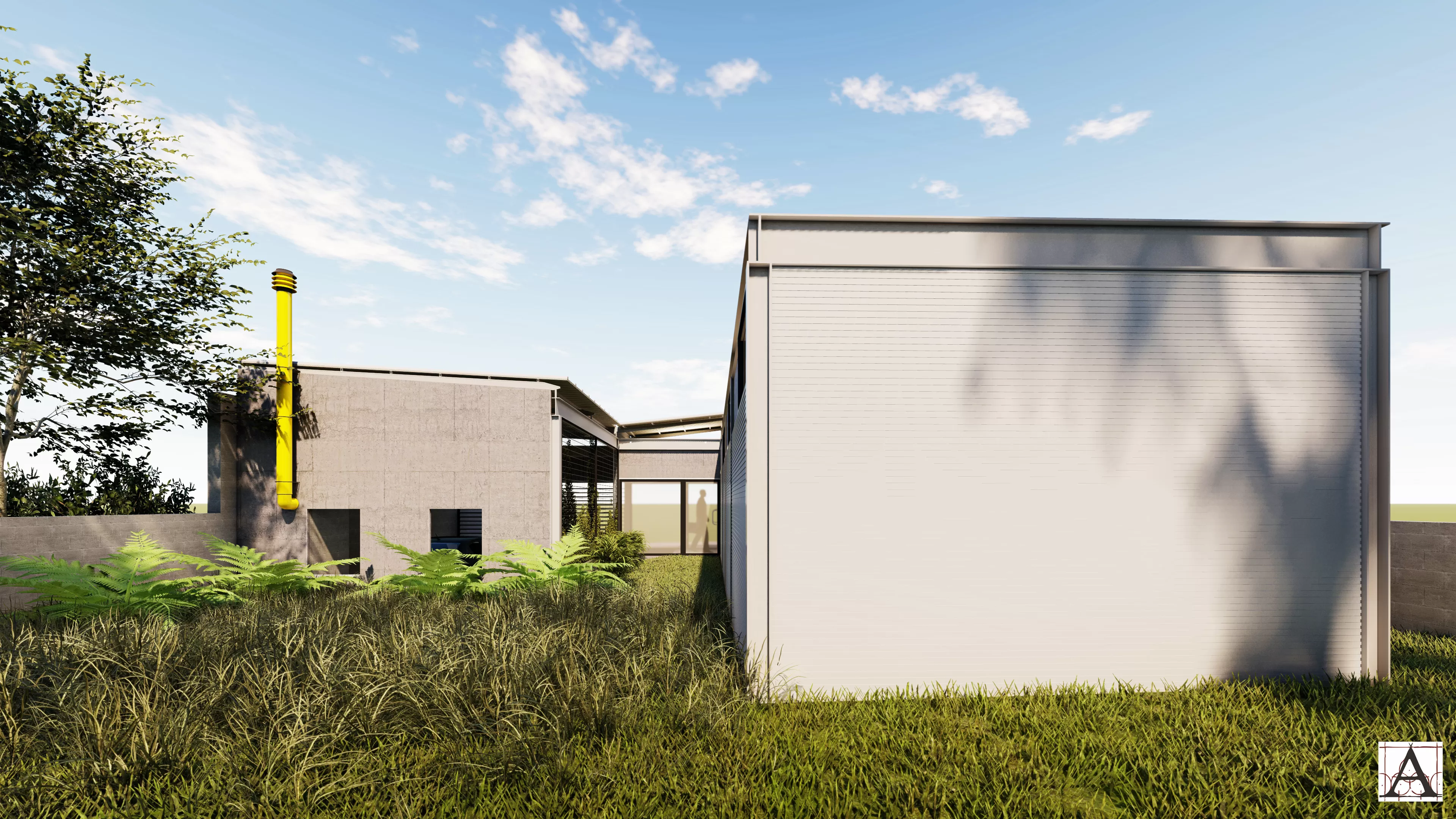 Toda a estrutura e fechamentos externos e internos foram pensados em elementos pré fabricados: Estrutura de pilares e vigas em perfis tipo “i” , fechamento externo ora em placas de concreto alveolar ora em placas de aço galvalume pré pintadas com núcleo em PIR e todos fechamentos internos em placas de gesso acartonado (dry wall).