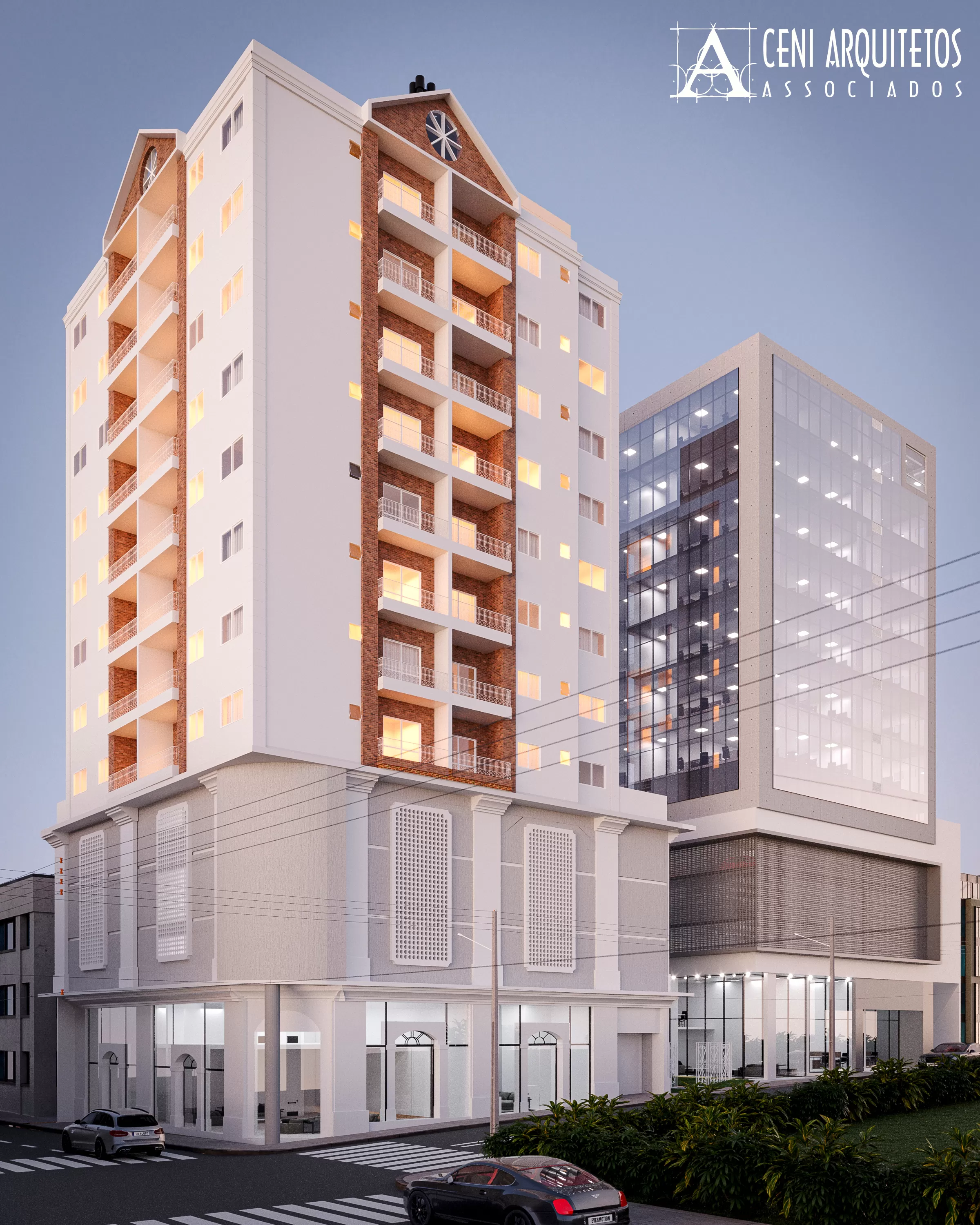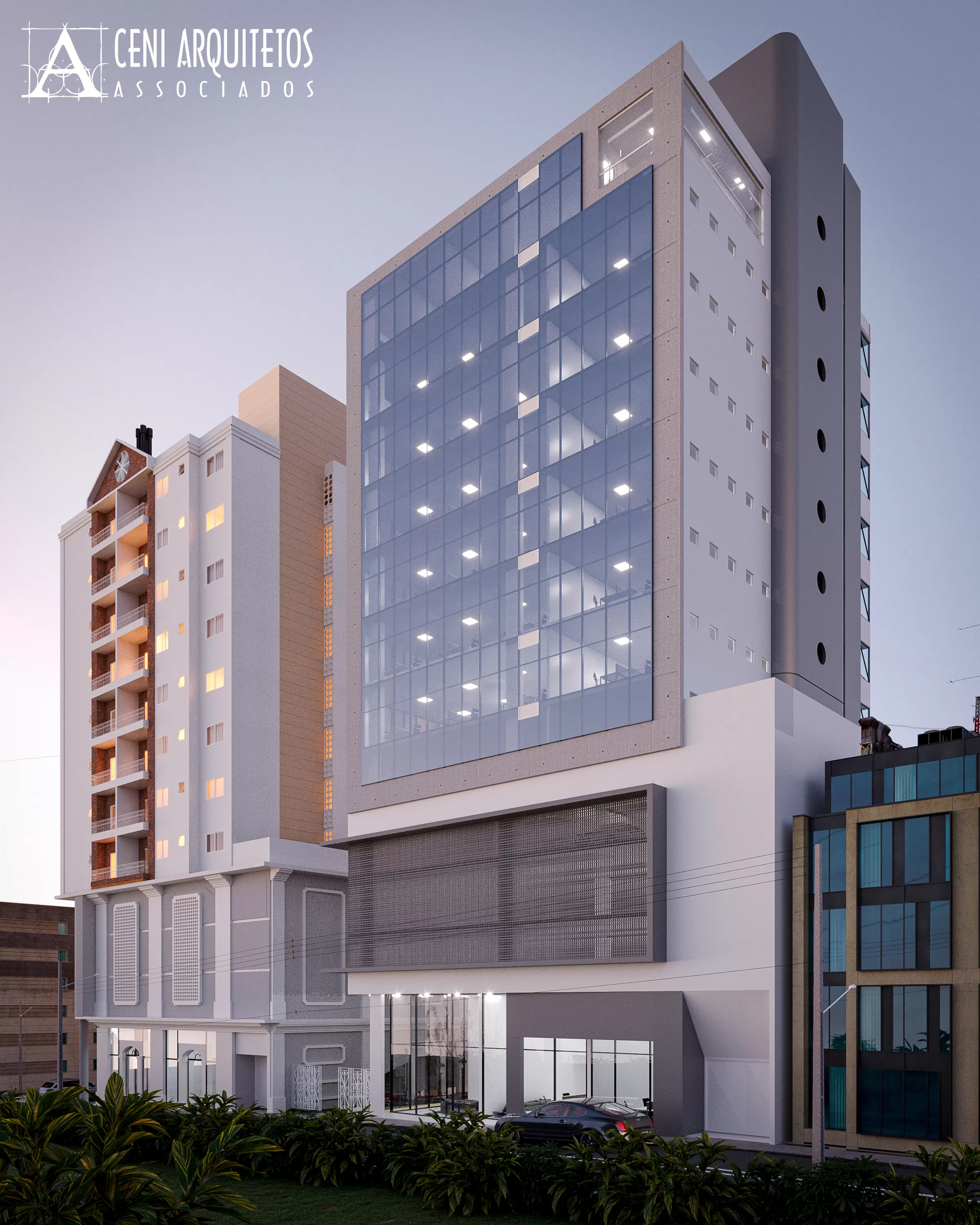Projetados para um terreno central do município que recentemente teve seu Plano Diretor atualizado, buscando a verticalização na zona central e potencialização entre a relação pedestre x edificações, o projeto contempla dois edifícios em um único lote, conectados por uma praça semi pública.