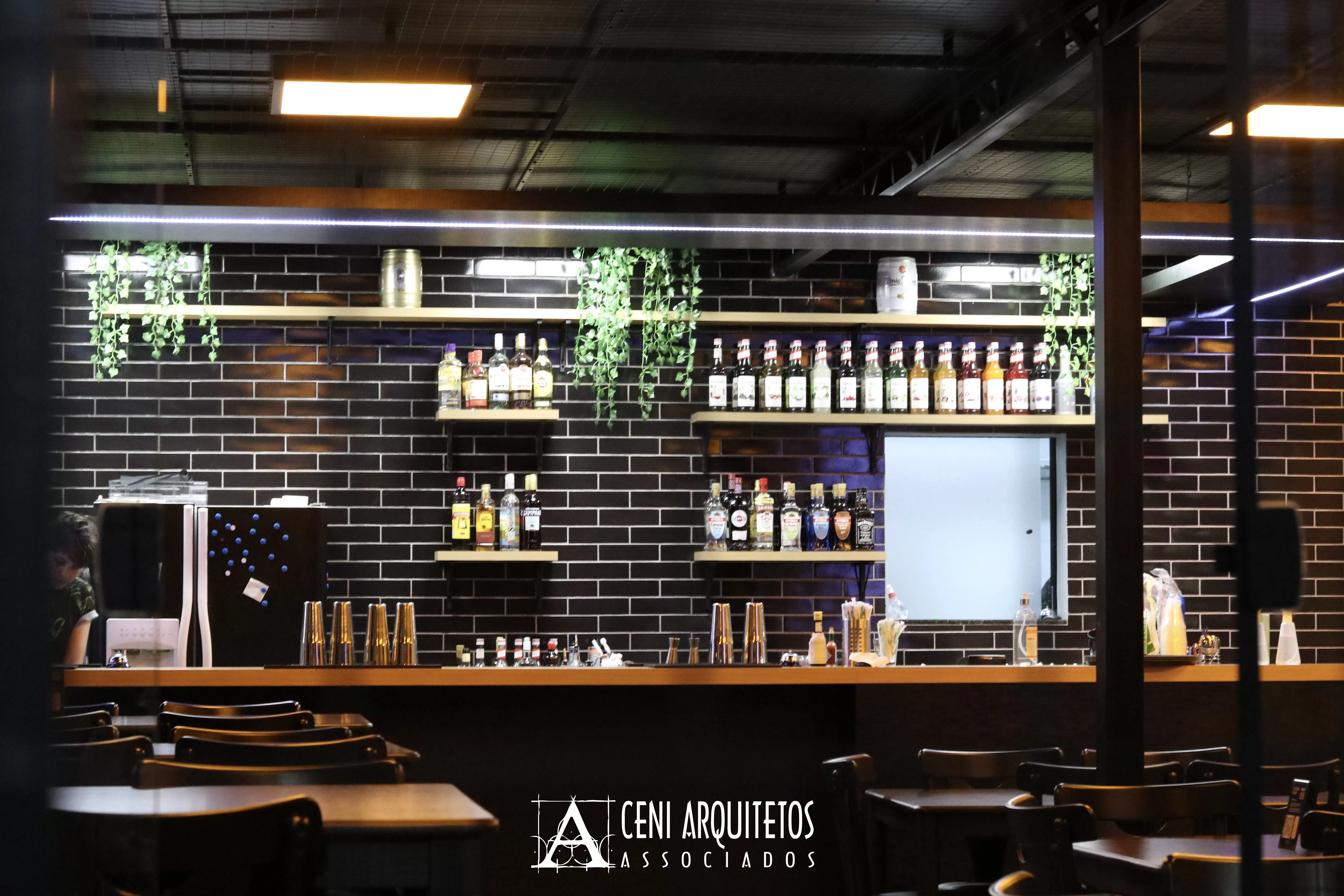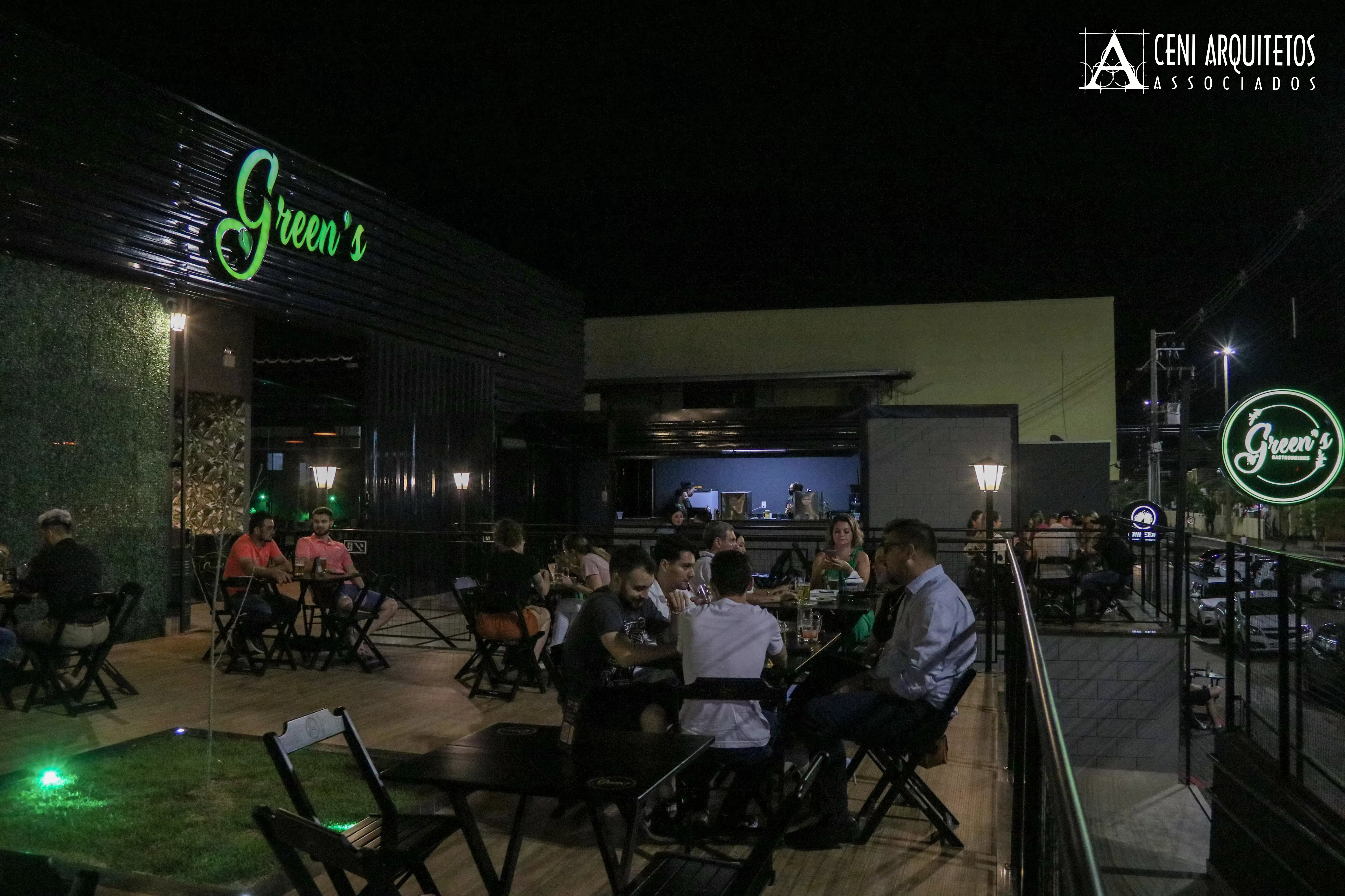 Greens Gastrodrinks. Neste projeto o desafio foi transformar uma antiga residencia, numa importante avenida de Francisco Beltrão, em um restaurante, com seus diferentes fluxos, públicos e funções. A proposta foi criar uma nova fachada, anexa à original da casa, criando um amplo corredor de acesso, responsável pela distribuição dos diferentes fluxos que um restaurante exige. A fachada foi composta pelas texturas propostas pela marca do Green’s. O resultado foi um frontão em estrutura metálica que marca a nova edificação. O extenso programa é composto por 03 espaços de estar, com layouts distintos, área externa coberta, deck frontal, foodtruck, banheiros e uma horta ecológica, que serve de insumos para a confecção dos Drinks ofertado pela casa.