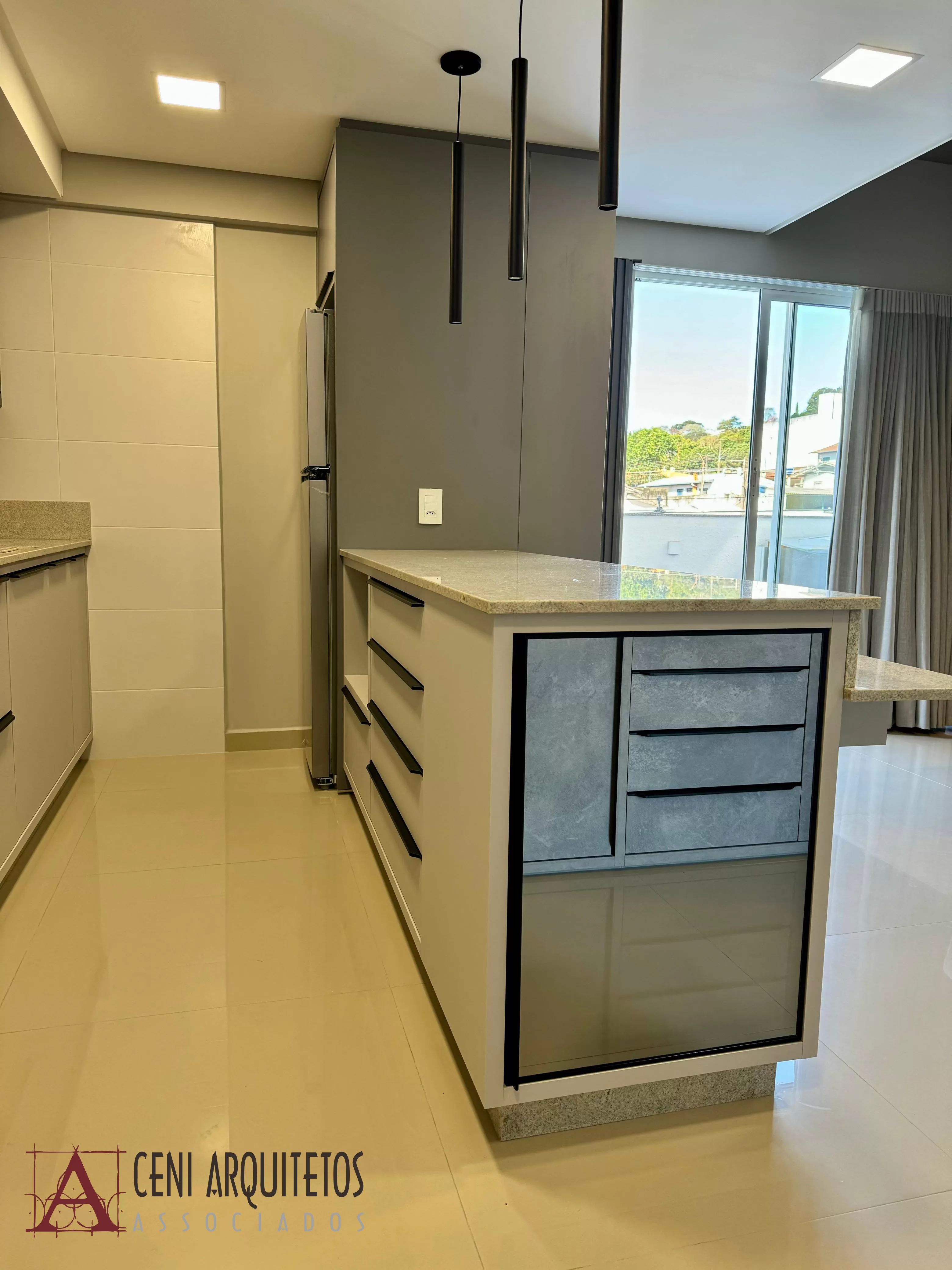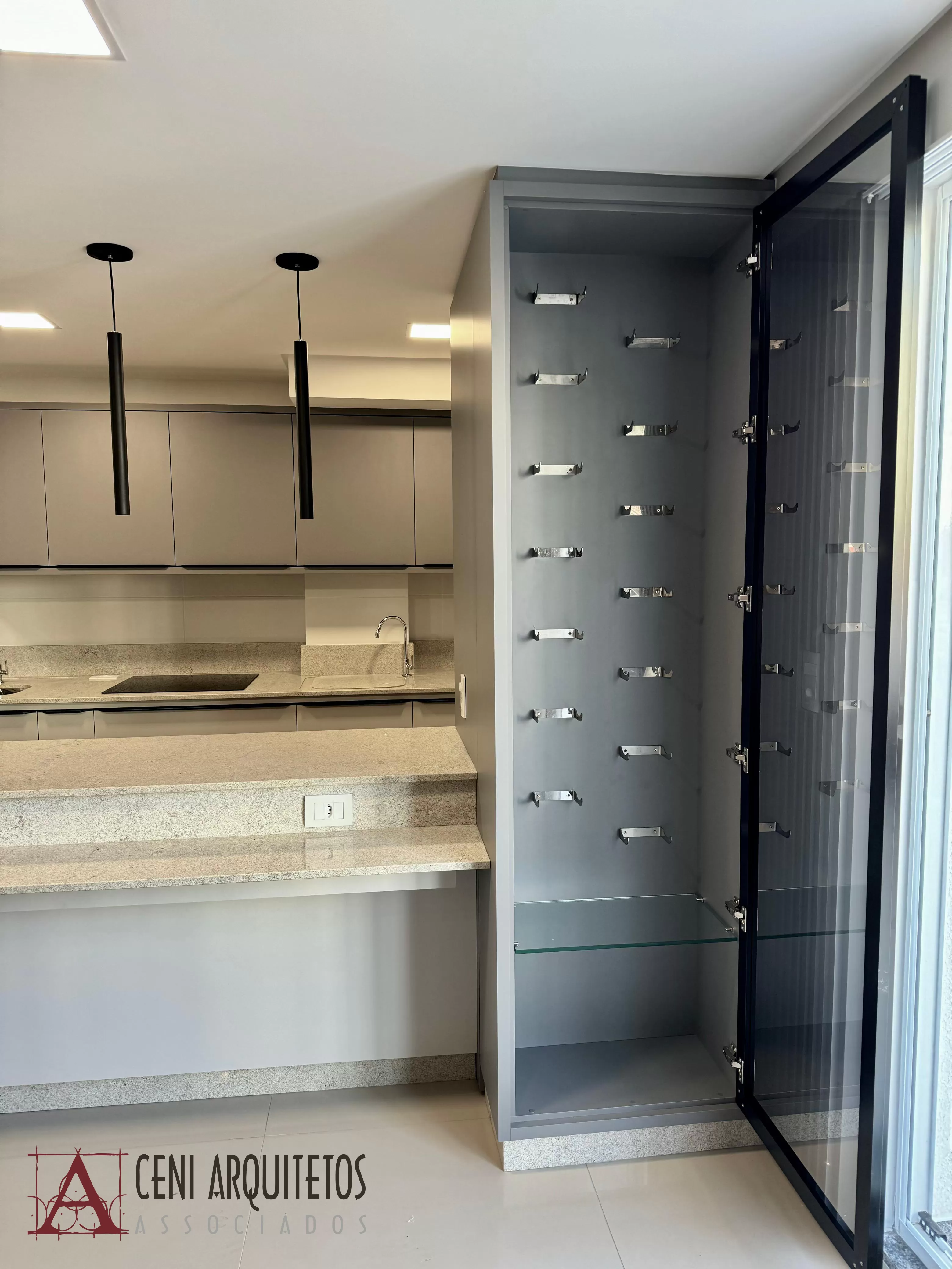 A bancada de refeições, com um espaço adicional para armazenamento, e a adega vertical foram projetadas para atender às necessidades práticas e ao estilo de vida do cliente, completando o ambiente de maneira funcional e elegante.