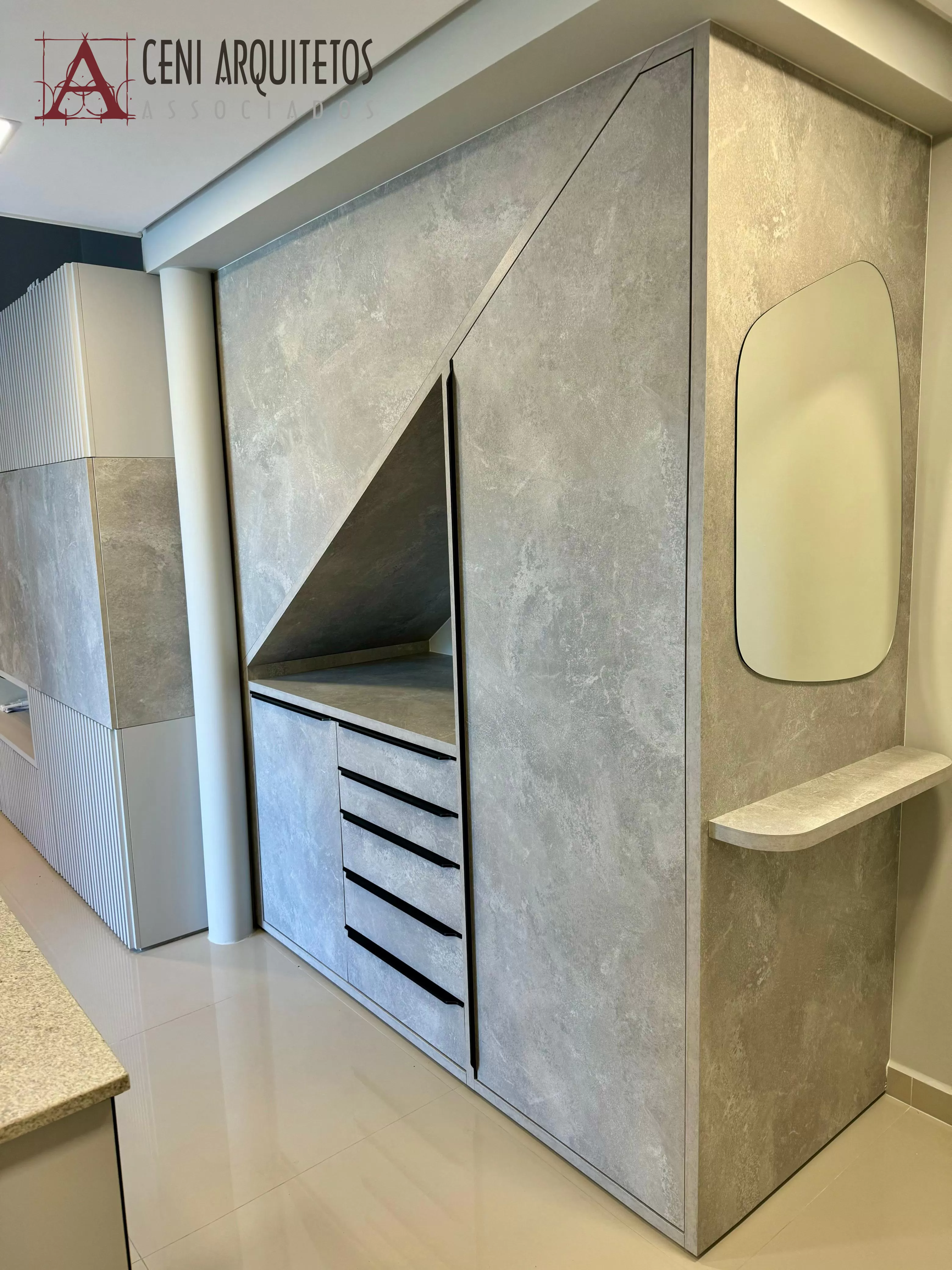 Em um projeto personalizado, consideramos as especificidades da rotina do cliente e suas preferências individuais. Para este projeto, que solicitava um apartamento em tons de cinza, a seleção dos materiais foi focada na variação de texturas, proporcionando profundidade e complexidade ao que, à primeira vista, parecia simples.
