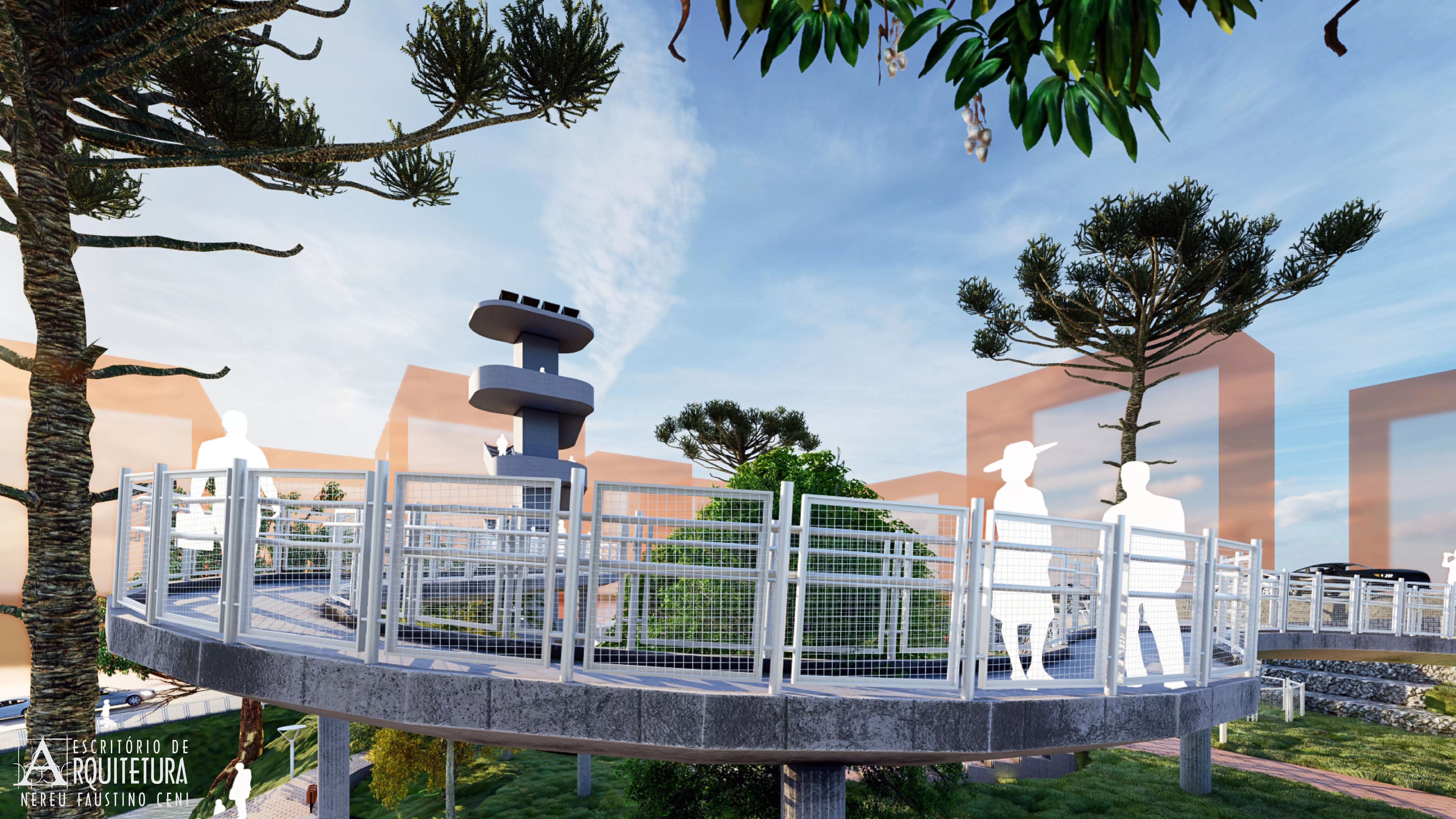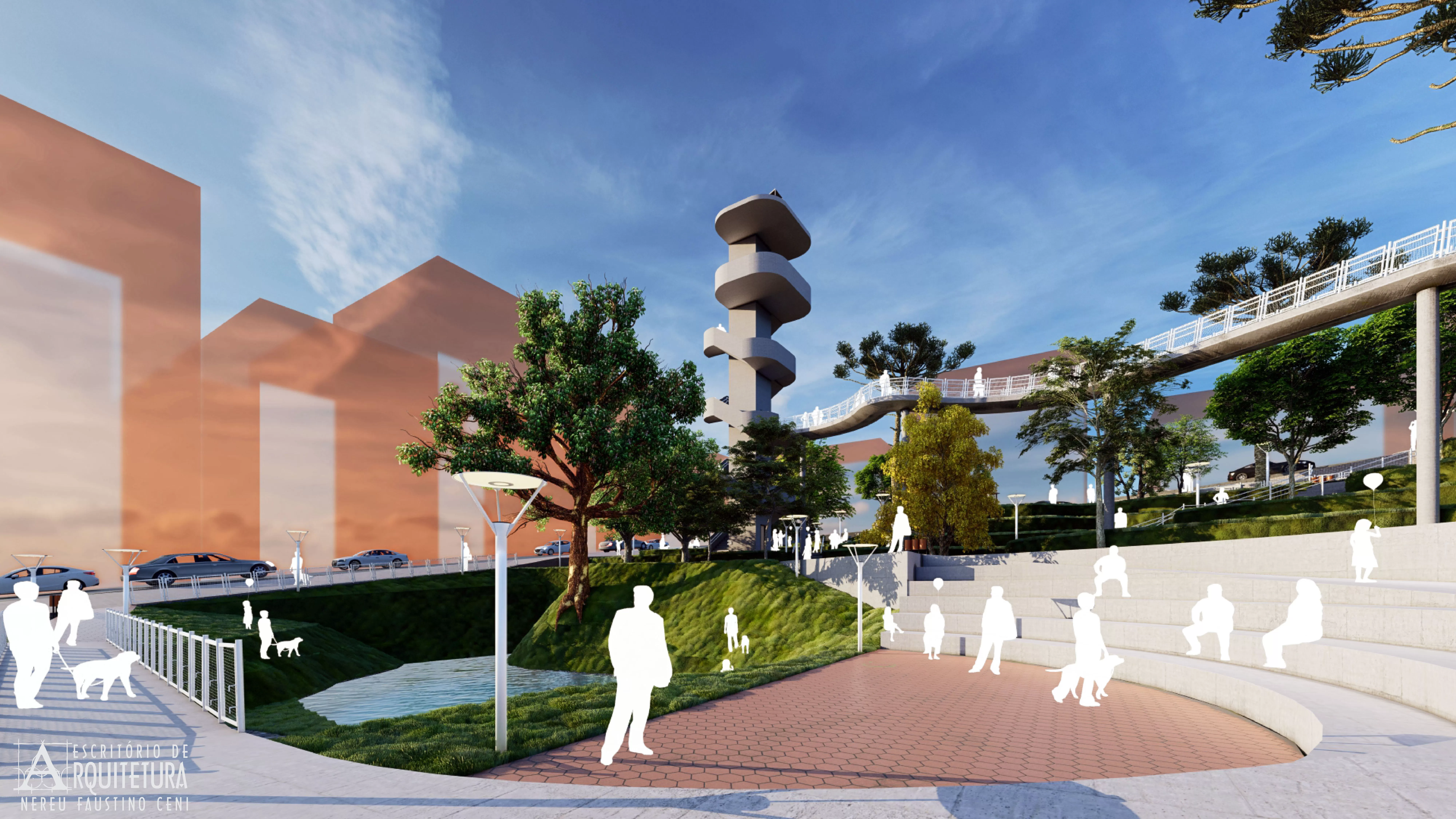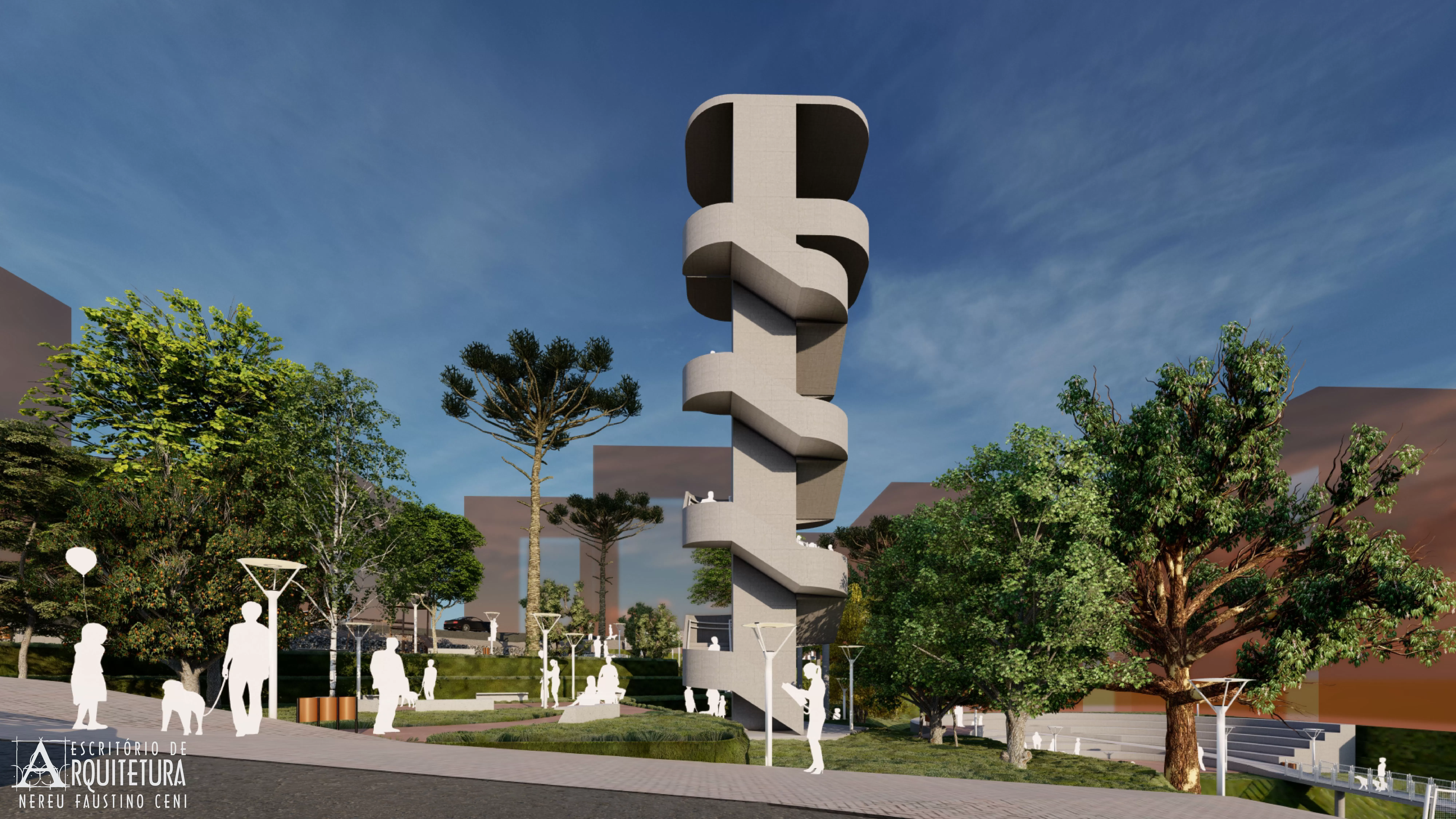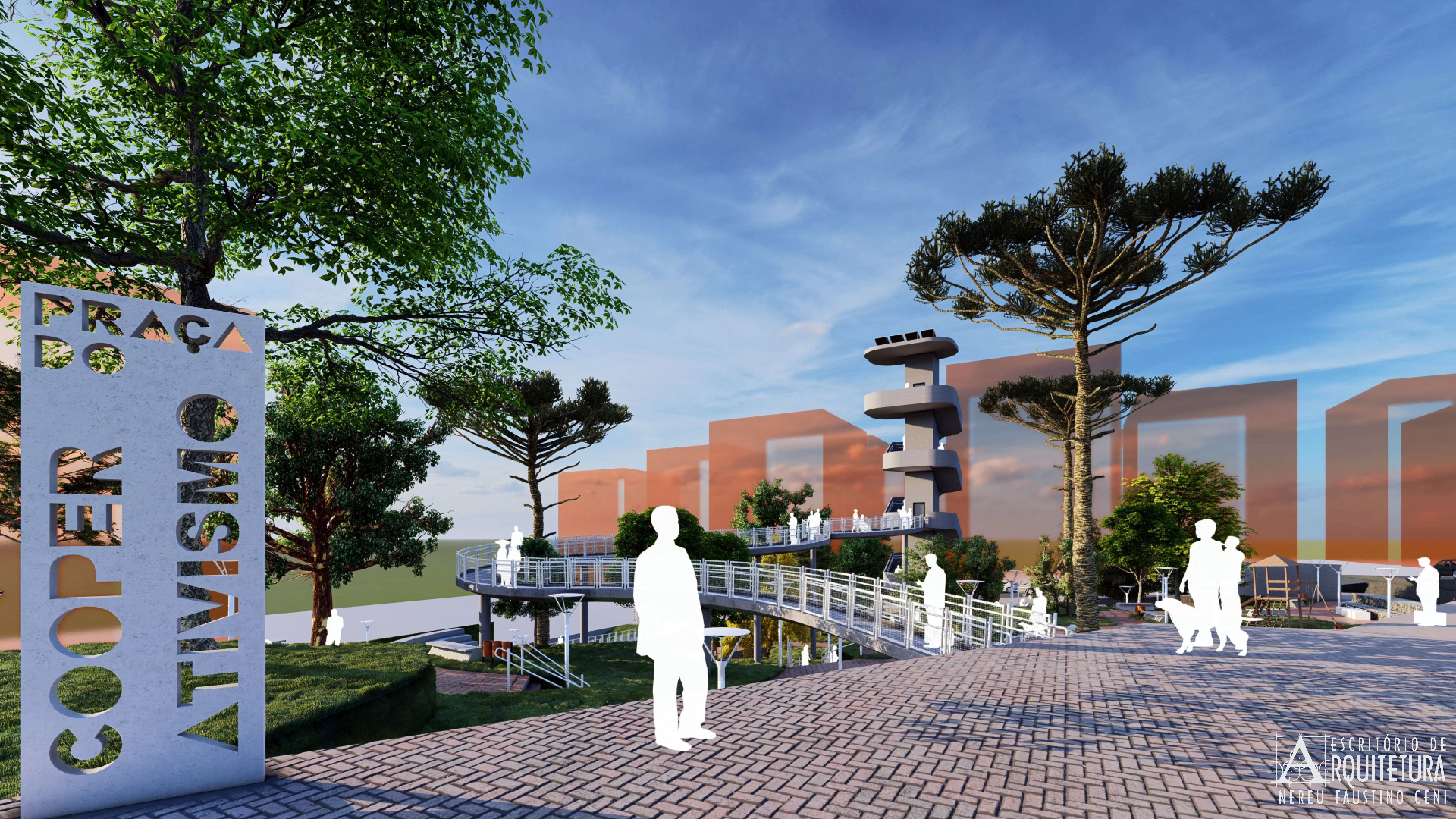 Praça proposta pelo escritório para a ocupação do lote na esquina entre as ruas Tocantins e Osvaldo Aranha no Município de Pato Branco. Intitulada de Praça do Cooperativismo para instigar as pessoas a atuarem de forma solidária e fraterna no convívio urbano e na preservação do meio ambiente.