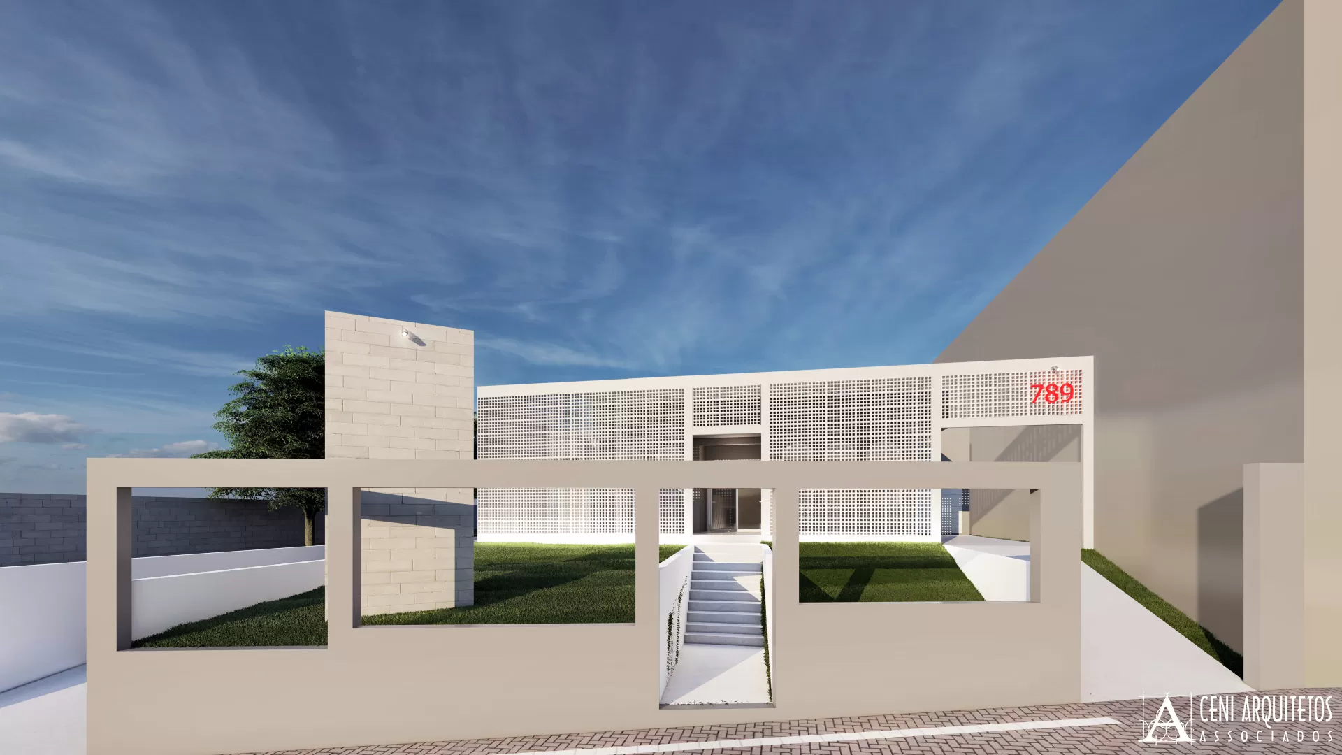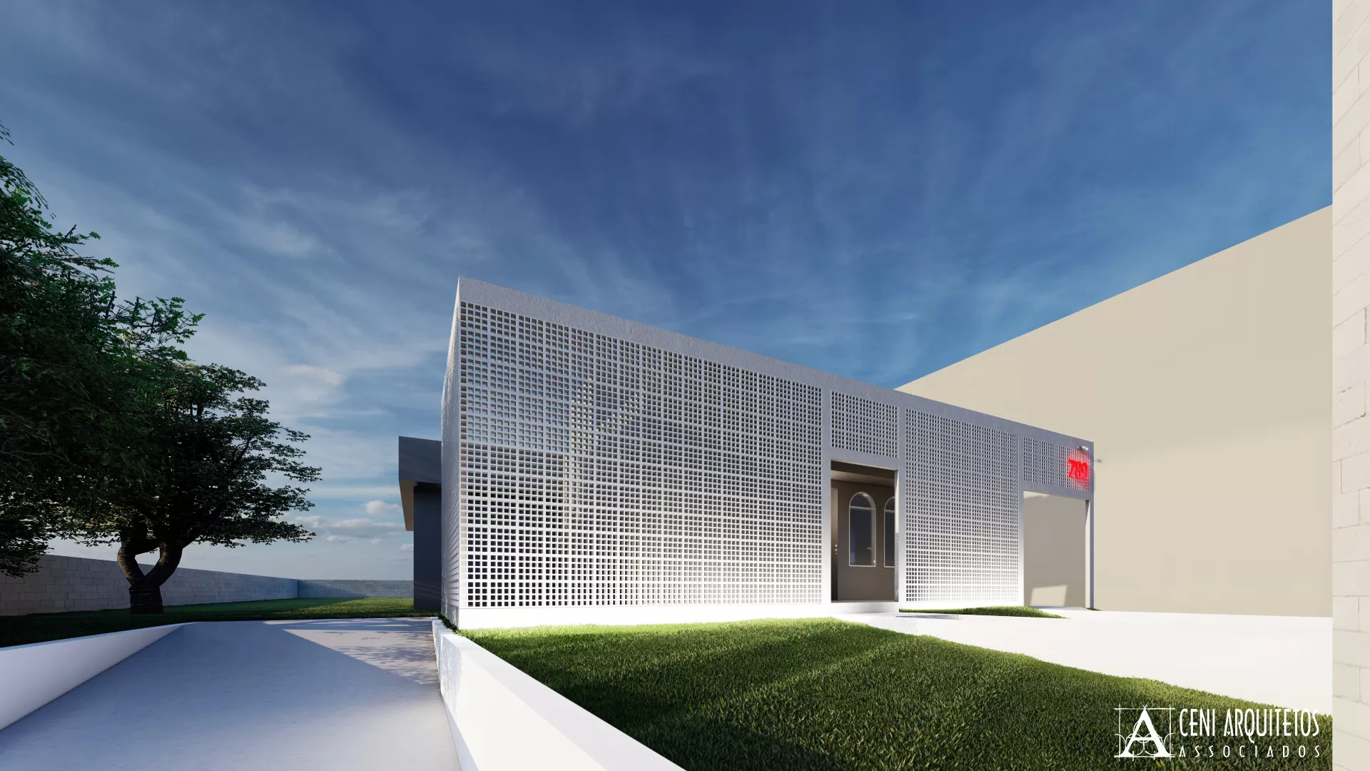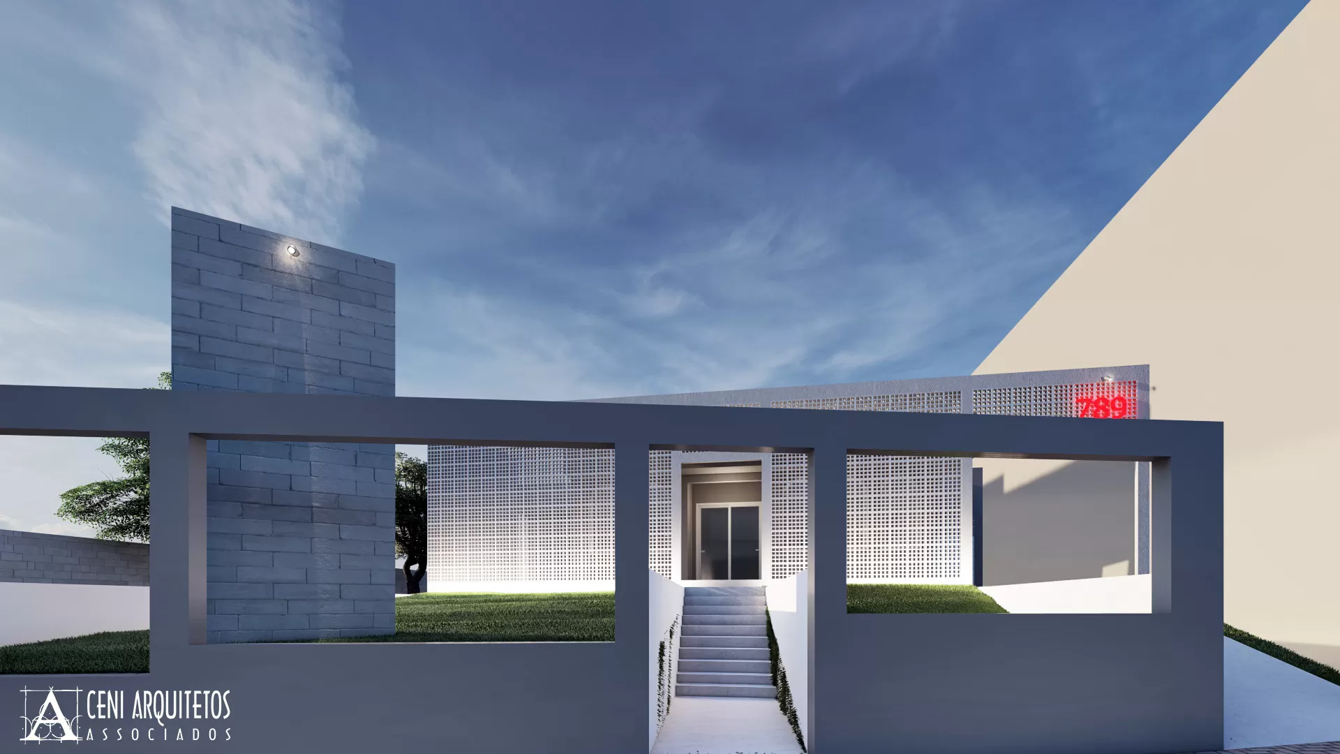 Optamos pelo uso de elementos vazados de concreto pintados em branco, envoltos por estrutura de concreto aparrente, trazendo conforto e privacidade principalmente por ser fachada Oeste, onde recebe muito sol a tarde. Canaleta de iluminação com led cor branca destaca a geometrica dos blocos à noite. No recuo, o totem em blocos de concreto receberá as logomarcas das empresas que utilizarão o espaço.