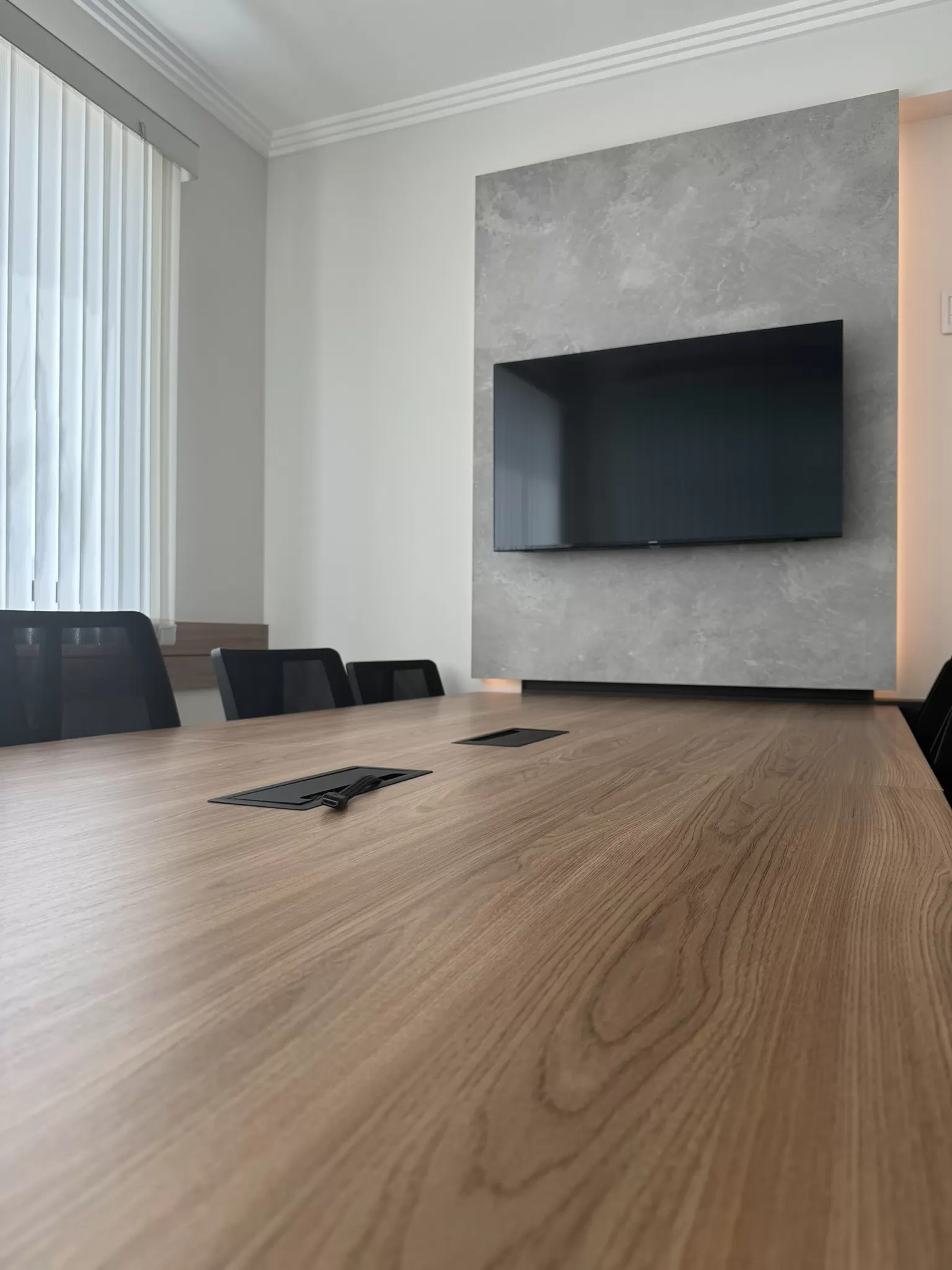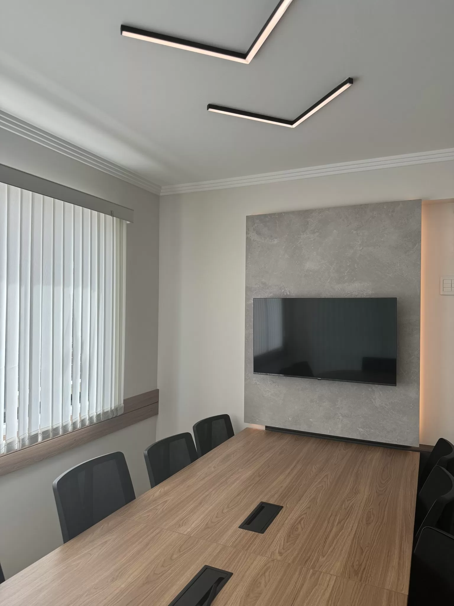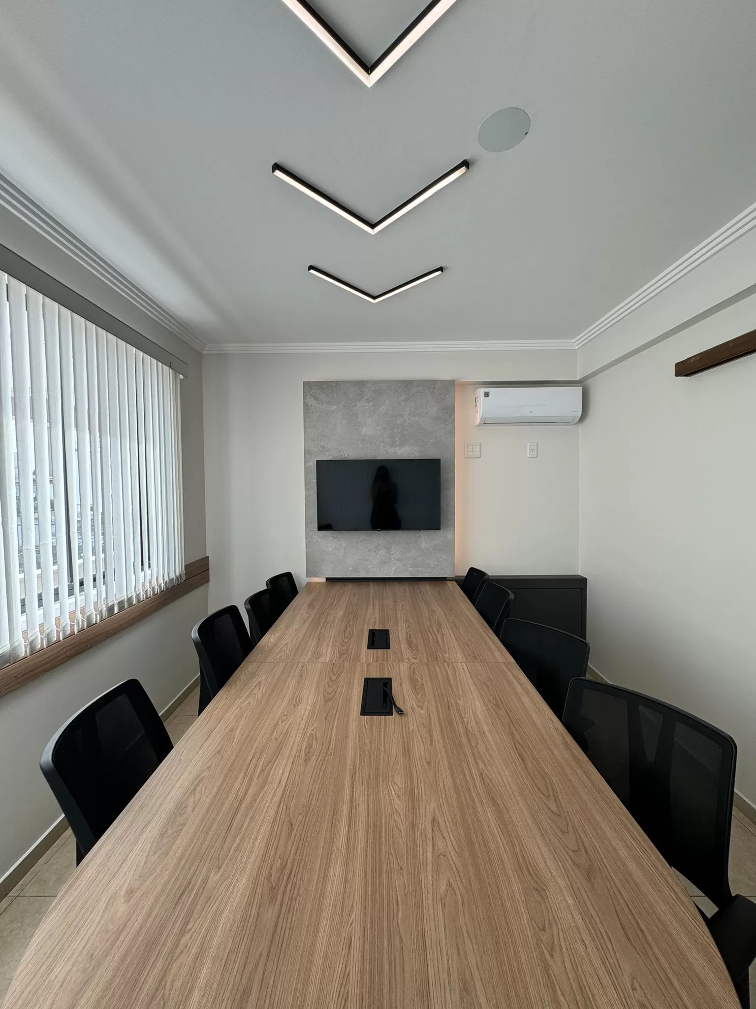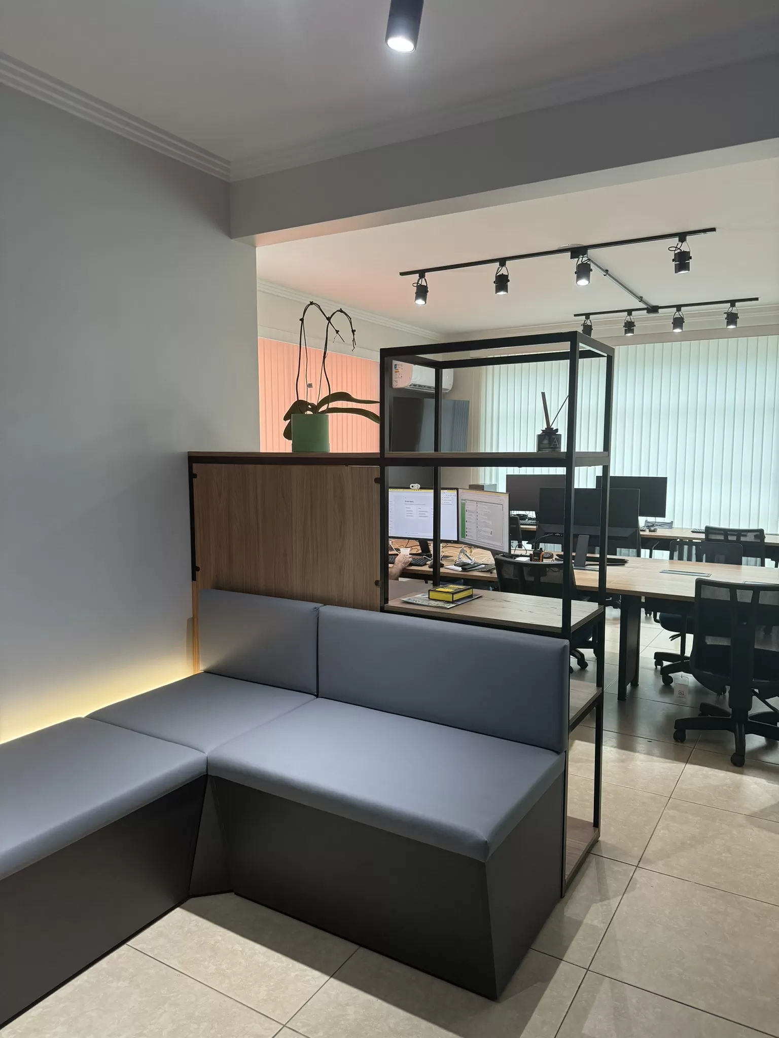 Projeto de uma reforma onde foram retiradas divisórias em drywall para que a sala de trabalho comportasse todos os funcionários em grandes mesas de trabalho conjunto. No projeto de interiores foram criados três ambientes. O primeiro que acolhe os funcionários e os eventuais clientes com um hall com paredes nas cores da empresa e com as logos em destaque e um painel de TV com videogame para momentos de descompressão. Já na sala de trabalho o principal são as mesas com tomadas embutidas que recebem a energia através dos pontos de luz do teto com a conexão em eletrodutos pretos e também móveis de apoio para impressora, cafeteira e decorações. Na sala de reuniões é importante destacar a iluminação em perfil de LED que direciona a atenção ao painel principal com a TV.